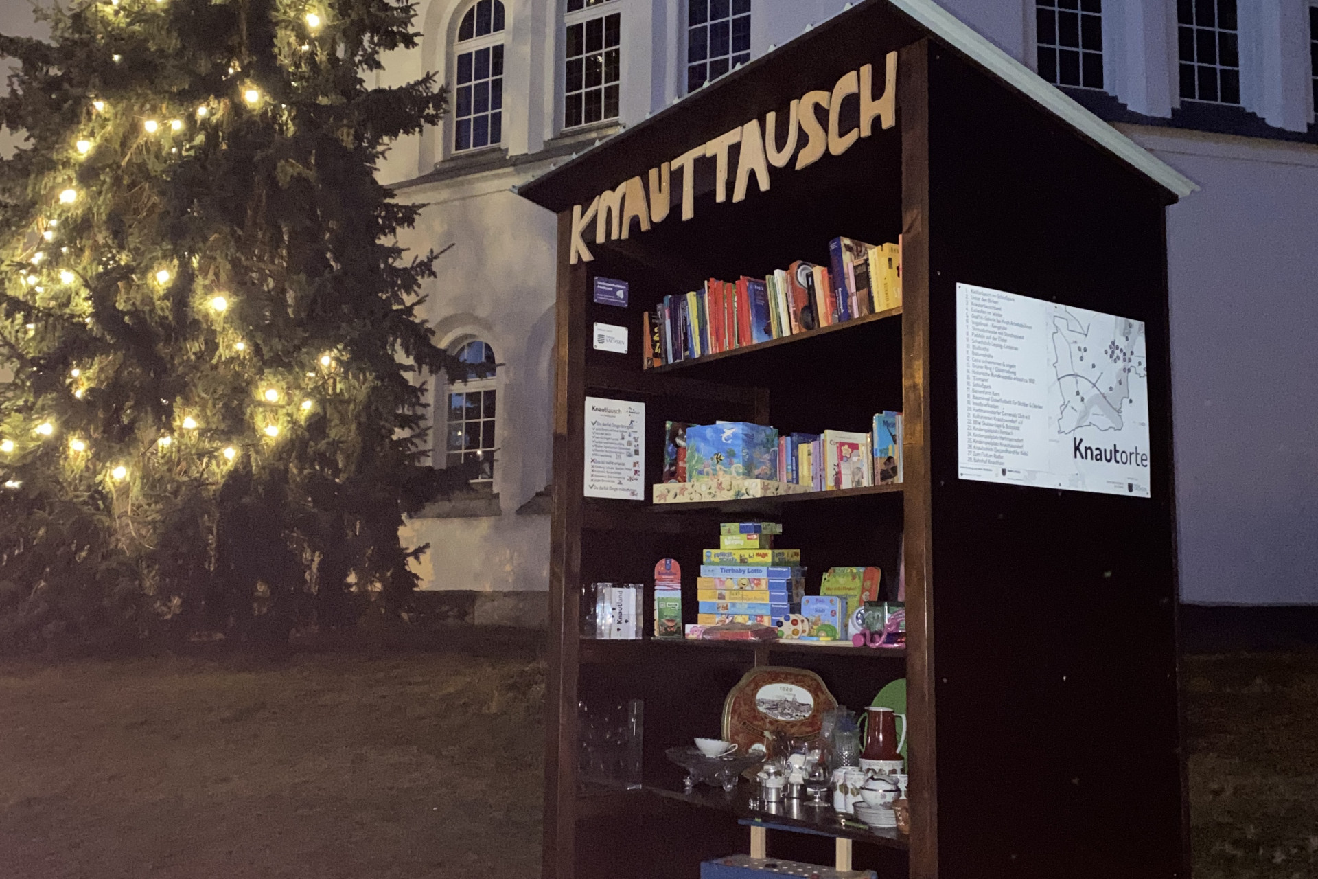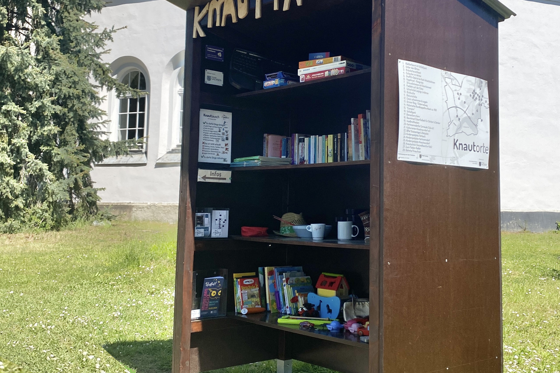 Das Knauttausch ist ein Tauschregal für alle. Bis auf Kleidung, Kosmetik und Verderbliches können die Menschen aus dem Knautland alles tauschen, was sie selbst nicht mehr brauchen. Worüber sich aber jemand anderes noch freut. Das Tauschregal befindet sich auf dem Gelände der Hoffnungskirche (Seumestraße 141).